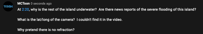 Here is a still from the video where the island is partially obstructed. Or, maybe, if the earth is flat, the island is flooded.