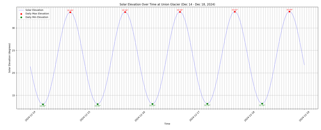 plt.title('Solar Elevation Over Time at Union Glacier (Dec 14 - Dec 18, 2024)')