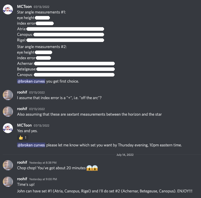 The star elevation measurements were presented to both participants on 2022-07-13 before 10pm US Eastern time. John was given first choice of the set of measurements to claim, he deferred by not making a choice within 24 hours, so Roohif chose set #2. Screenshot included.