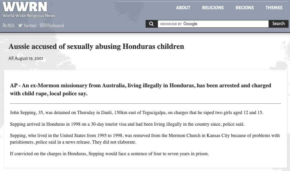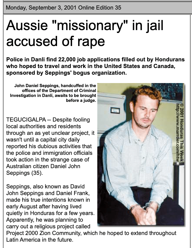 He moved to Honduras where Seppings was scamming people. Claiming he could get them a job paying significantly more than the going rate in Honduras. They just had to pay an application fee of 200 Lempira. He was arrested where they found 22,000 job applications. If he collected 200 Lempira for each application, this is 4,400,000 Lempira. The exchange rate on August, 2001 was 0.063024 Lempira to US Dollar. That’s $277,306, the police also found a plane ticket to Canada. It seems he was planning to leave Honduras with the money.