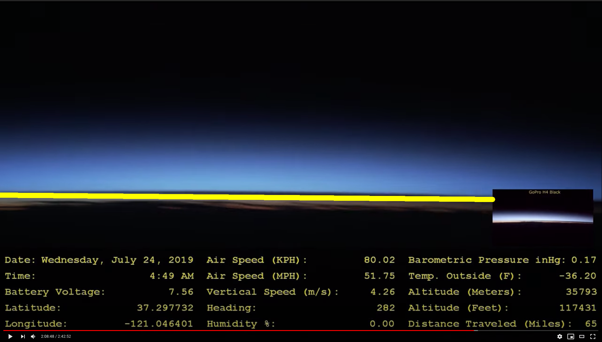 Here is a screenshot from Dwayne’s video at 117,431 feet, the yellow line is added to see the curve: