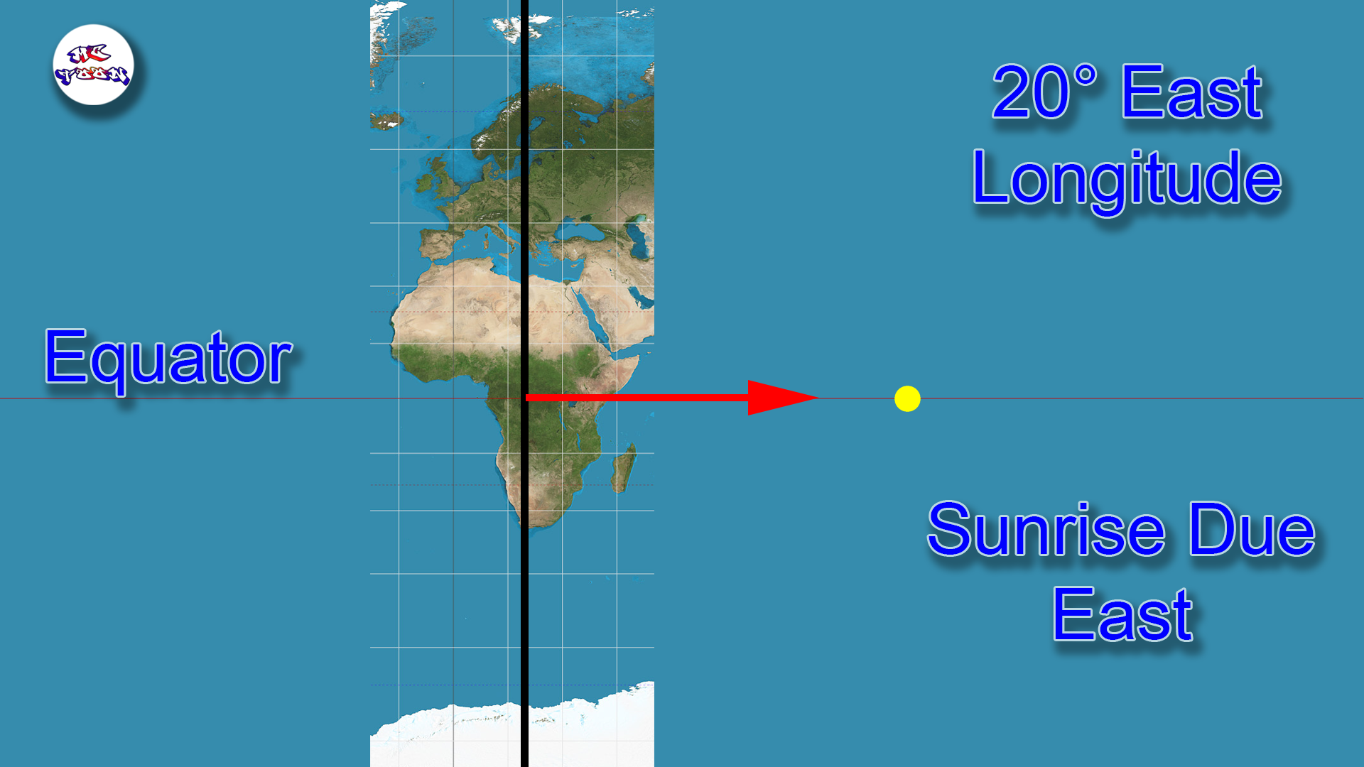 Consider the line of Longitude East 20°. This line of longitude has close to the most land covered from L’Agulhas, South Africa to Svalbard, Norway. The observations along this line of Longitude are easy to confirm either personally or by communicating with people that live near. On the day of the equinox, the sun rises at the same time all along this line of Longitude.