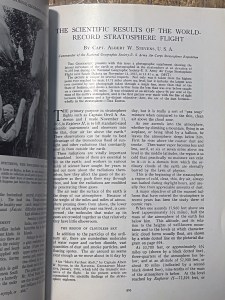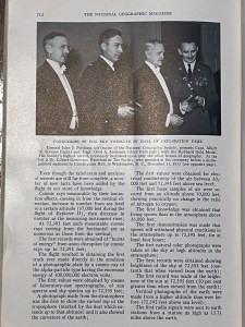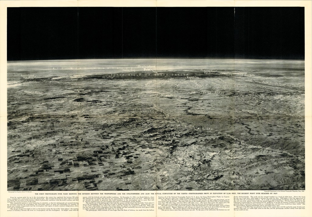 On November 11, 1935 Albert W. Stevens took a specially designed infrared camera to a height of 72,395 feet over South Dakota. Albert took the first photograph of the left to right curvature of the earth. This was published in the May 1936 issue of National Geographic. A 35″x17″ insert was included in the issue. I purchased a copy of the magazine and the fold out. A high-resolution scan of the insert is included below.