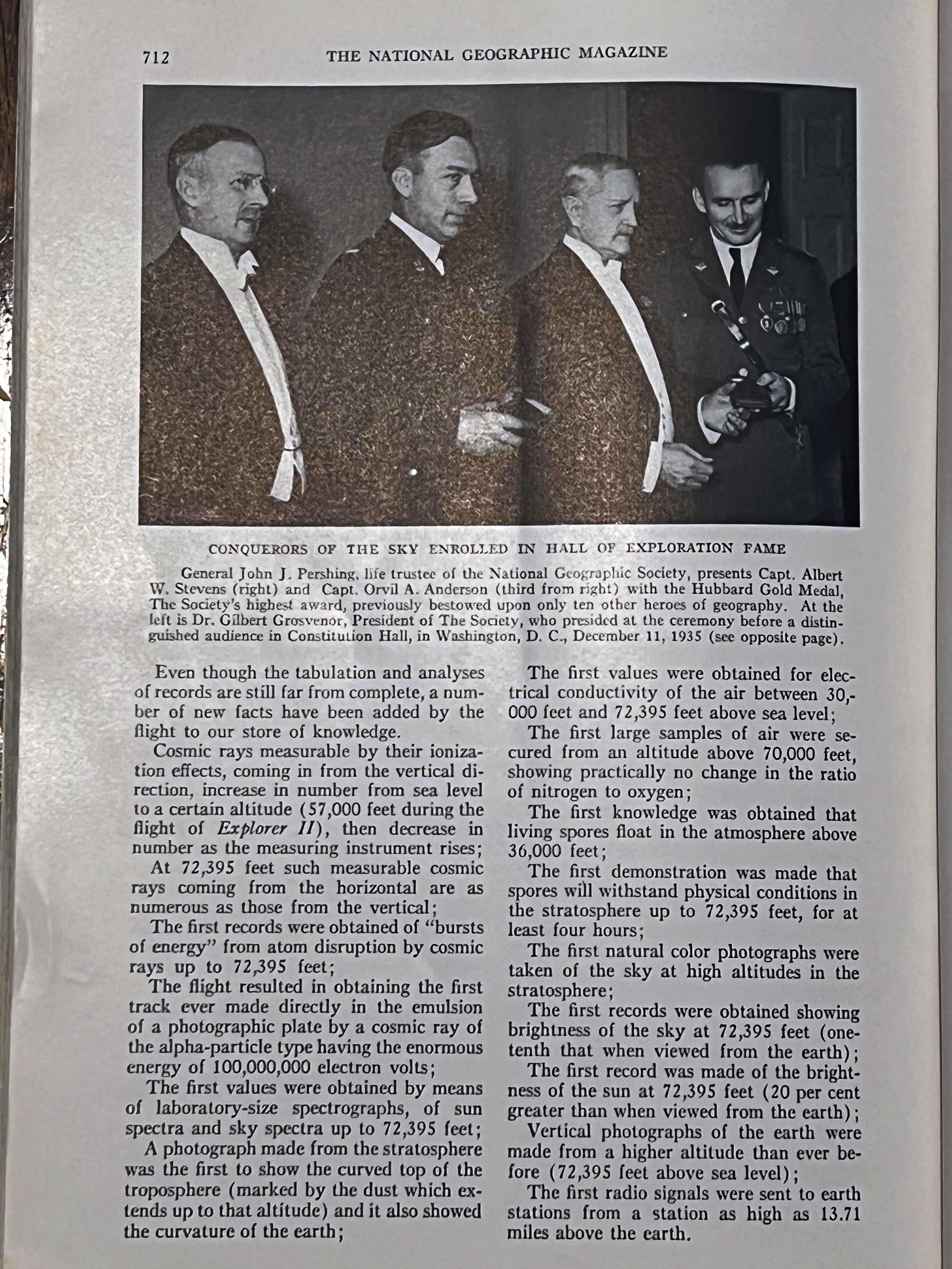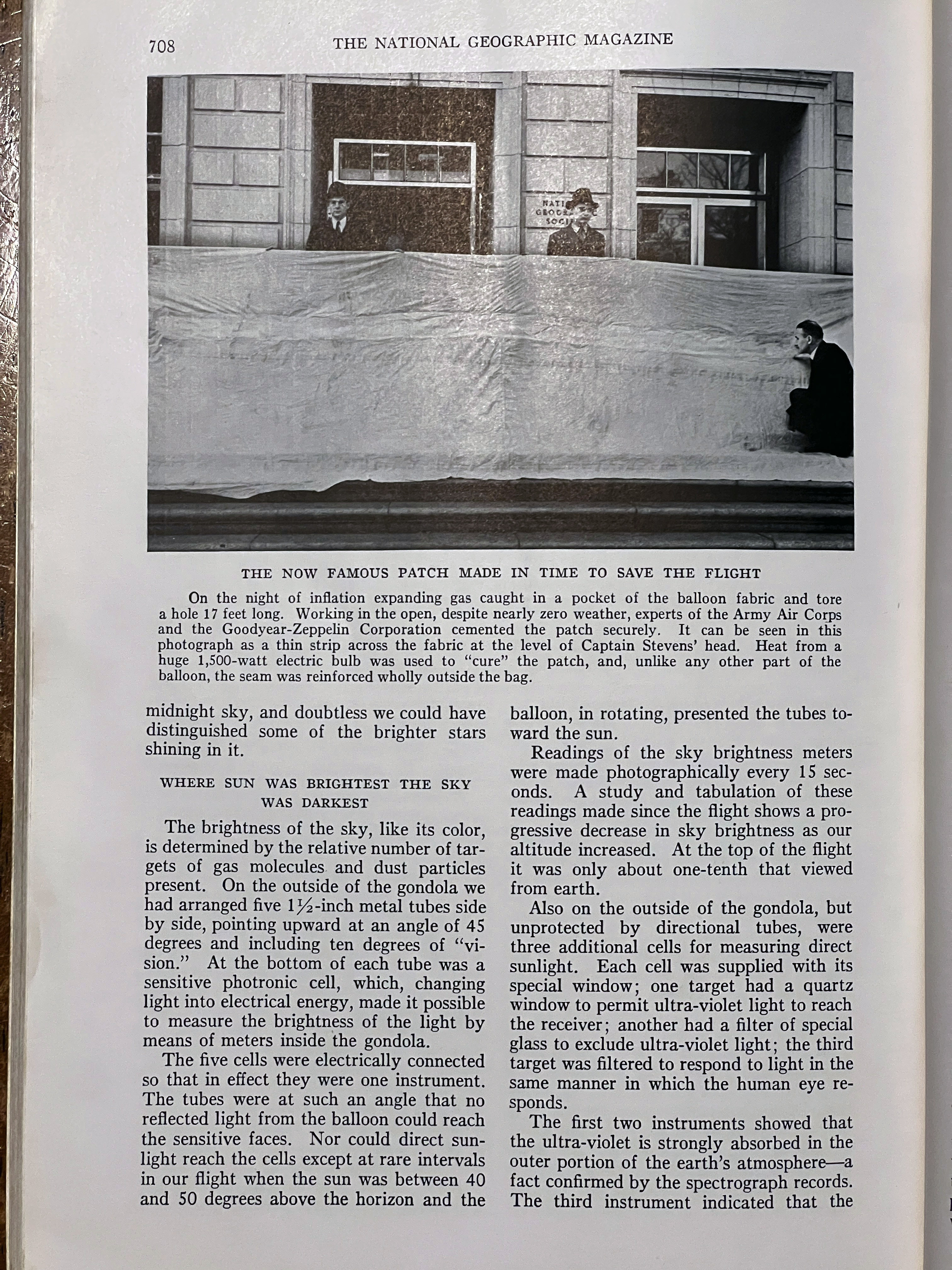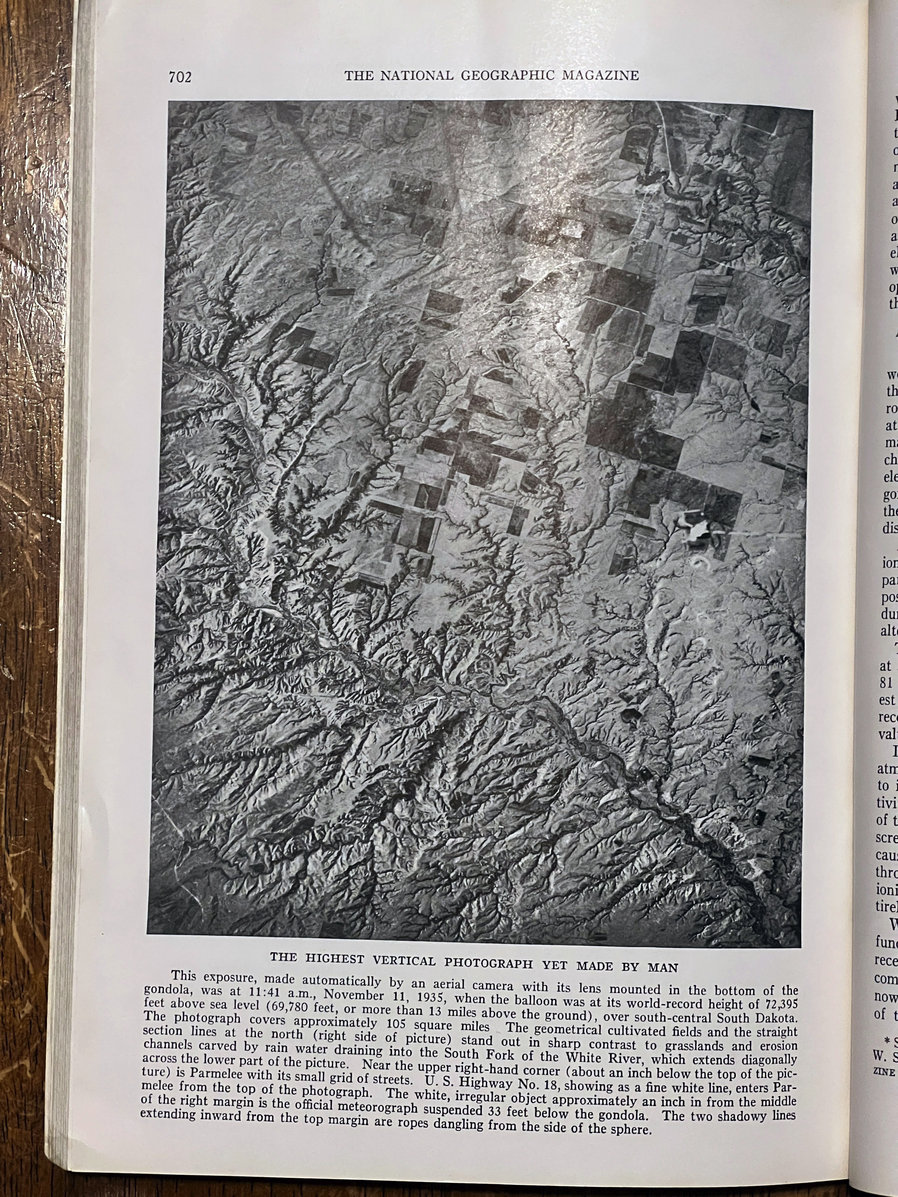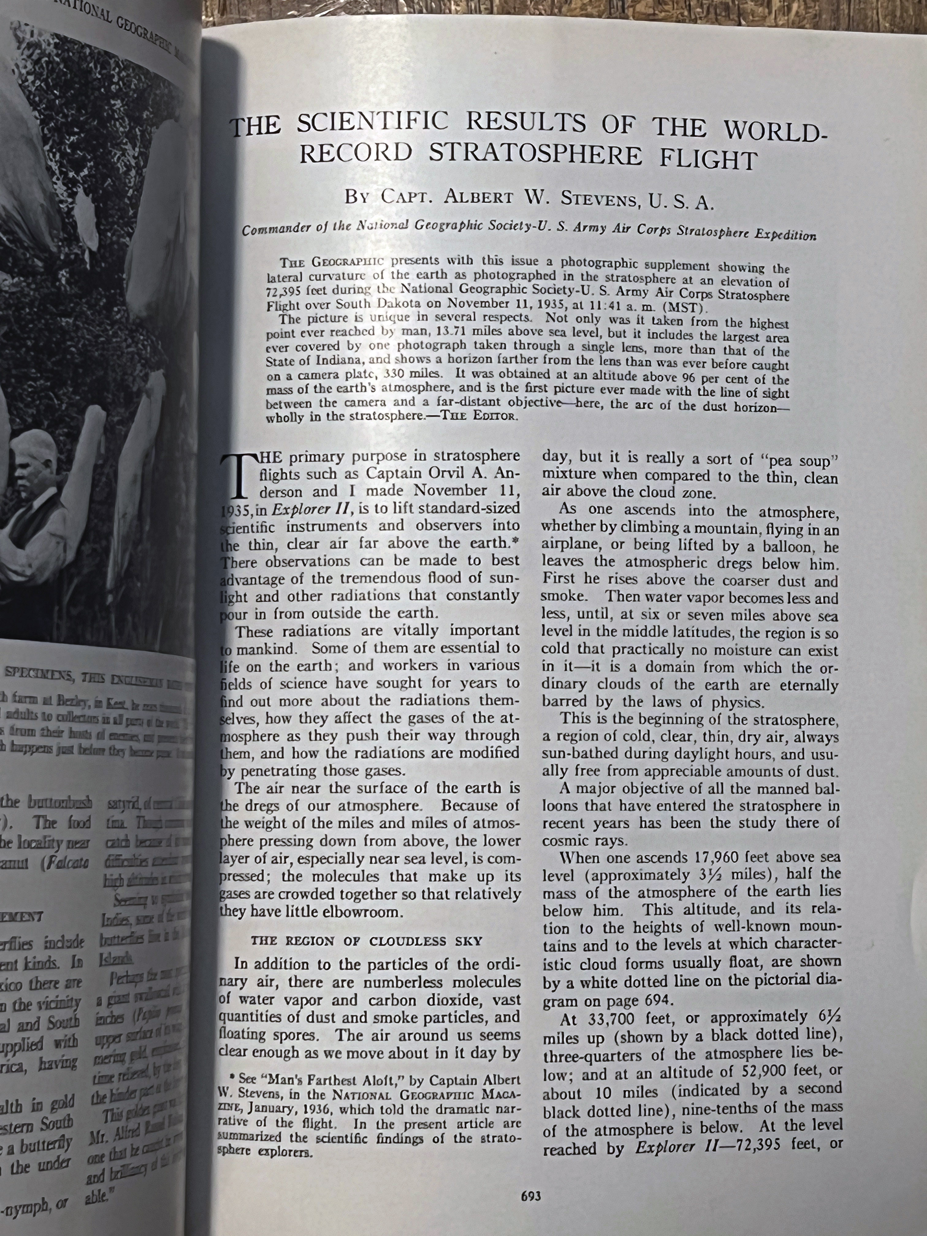 On November 11, 1935 Albert W. Stevens took a specially designed infrared camera to a height of 72,395 feet over South Dakota. Albert took the first photograph of the left to right curvature of the earth. This was published in the May 1936 issue of National Geographic. A 35″x17″ insert was included in the issue. I purchased a copy of the magazine and the fold out. A high-resolution scan of the insert is included below.
