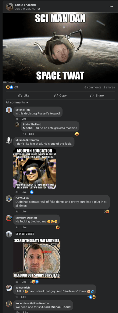 Flat Earth Insults Since flat earthers have no evidence they love to go low. Share this: Click to share on X (Opens in new window) X Click to share on Facebook (Opens in new window) Facebook Like Loading...