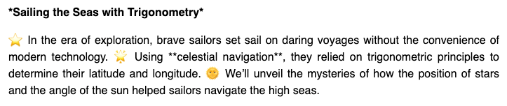 This is a lesson for 7th graders. It covers calculation, approximation, geometry, trigonometry. There is no part of lesson 4 that covers how to perform celestial navigation. There is an introductory section on the basics of how a sextant measures angles. Followed by a trigonometry review. This review covers triangulation but does not apply trigonometry to celestial navigation, it’s just a review like any geometry textbook would have.