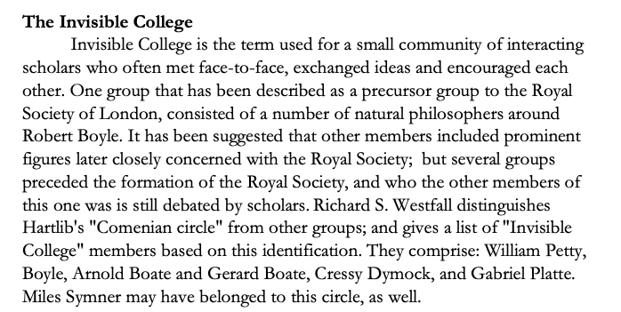 Here is a passage lifted from Wikipedia’s article on Invisible College