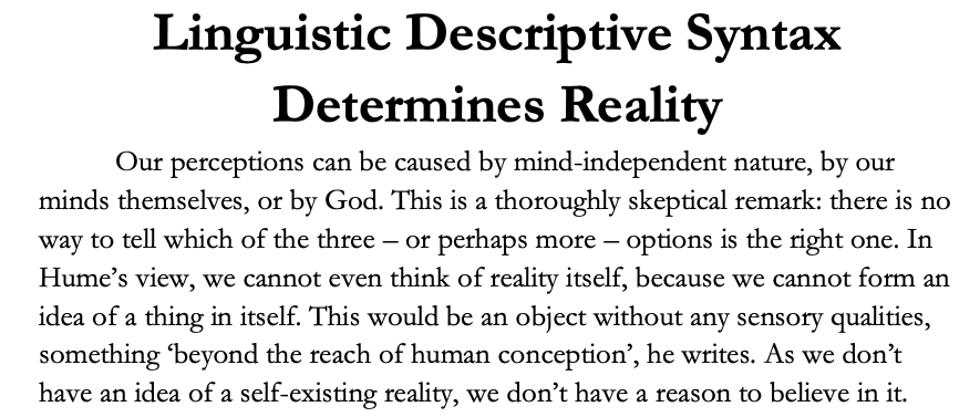 On page 36 Greg starts a section with the heading “Linguistic Descriptive Syntax Determines Reality” followed by a copy-pasted section about Einstein and Hume written by Matias Slavovis and published on aeon.com.