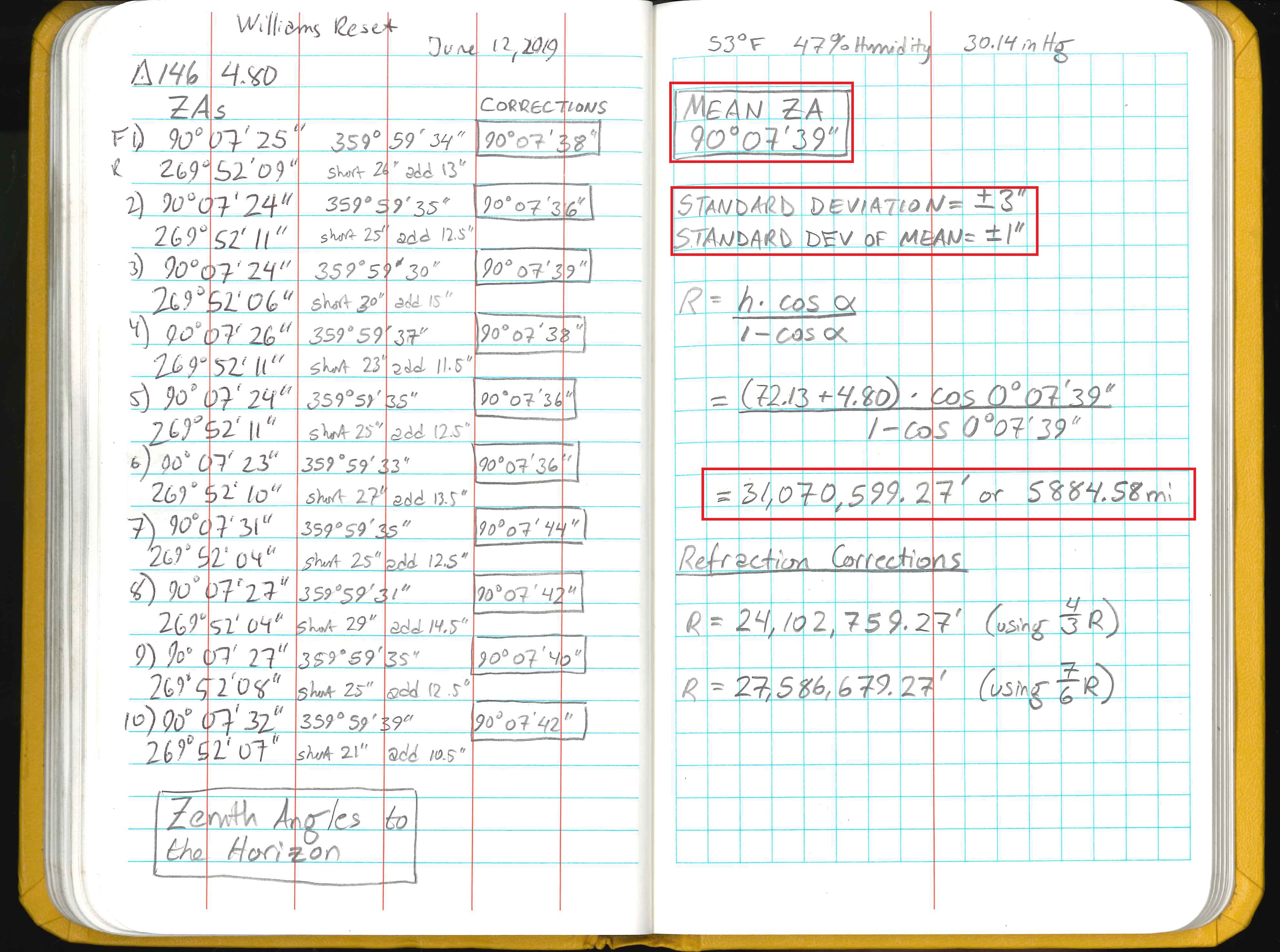 Note that there are two views, one at 90 degrees, one at 270 degrees. These two measurements are to negate the effect of any collimation errors. The final image has field notes and calculations from The Maine Surveyor. A total of 20 measurements were taken, 10 for each face of the theodolite. By averaging equal numbers of measurements from each face collimation errors are eliminated.