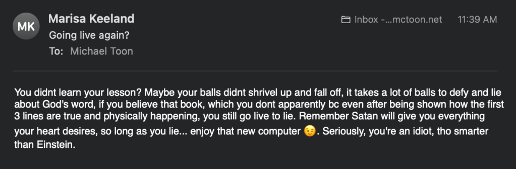 Marisa aggressively tries to be wrong. She is also very toxic.