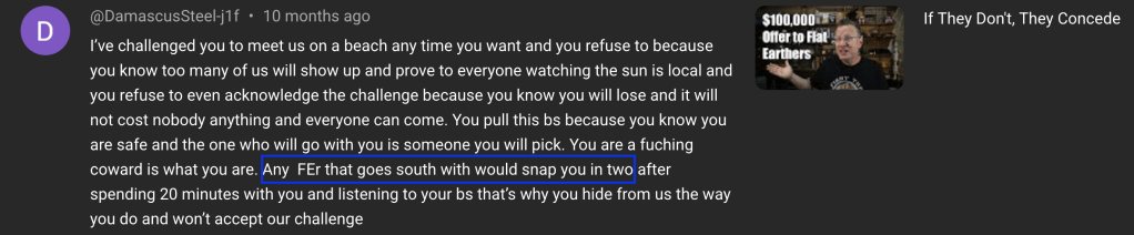 A huge percentage of flerfs are mentally ill. For example, DamascusSteele regularly comments on my videos on YouTube. This person has a large number of sock accounts: Bobswife, JohnThompsonthegreat, The final ex, The Big Boss, etc. You can see the mental illness on display in the comments of this video: https://www.youtube.com/watch?v=rfE2gUgk-os