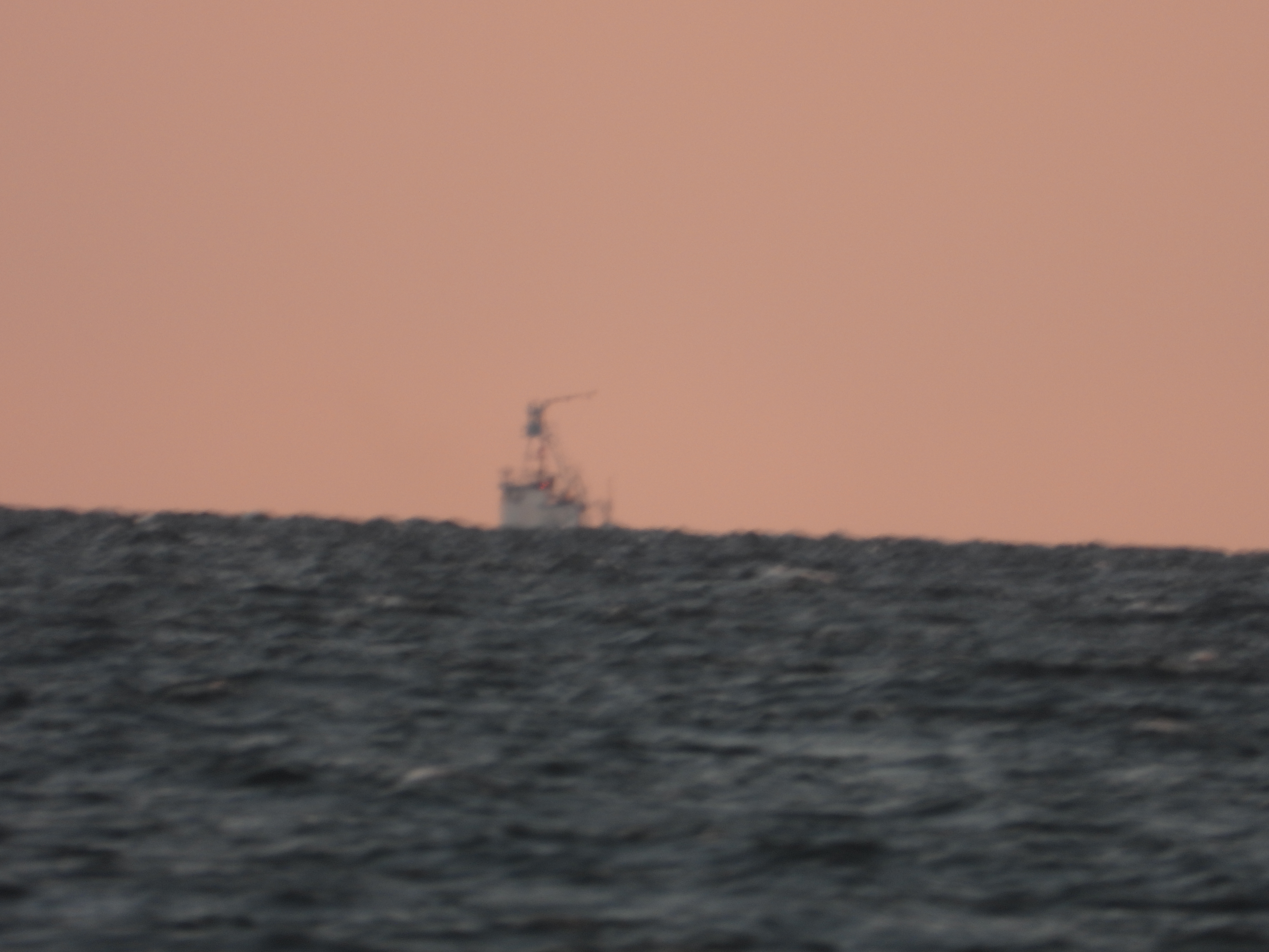 There were 2 cargo ships that had their entire hulls obstructed by the horizon and a boat that appears to be a fishing boat. The boat’s entire hull was also obstructed. Only the cabin and superstructure was visible.