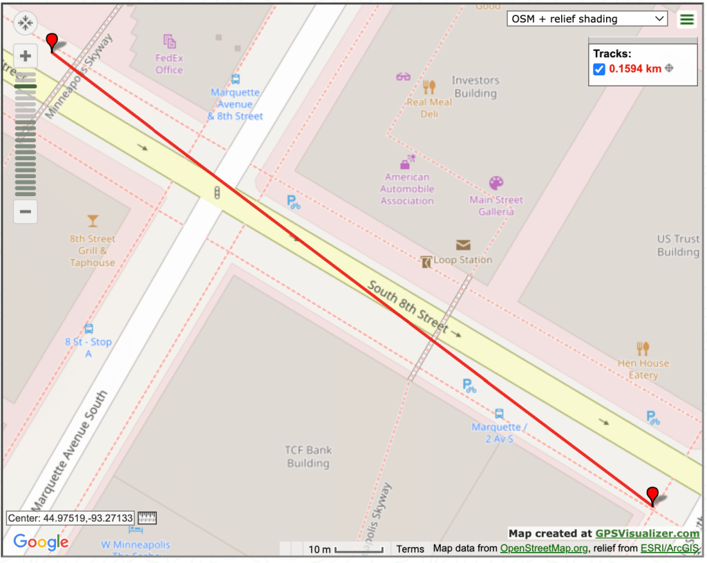 Walking 1 block east to 44.974760, -93.270526. Distance: 522.9 ft