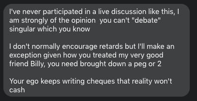 He has spent the last year saying “you can’t debate singular”. Whatever that means. He also trolls my posts on Facebook and blocks anyone that interacts with him. Such a snowflake.