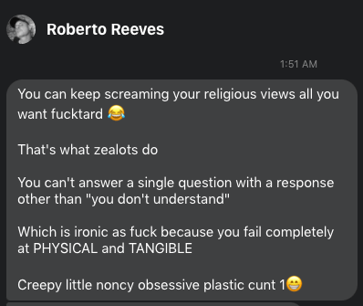 Roberto Reeves is a flat earther that doesn’t want to be called a flat earther because he knows that flat earther implies the person is stupid. HE wants to be called “globe skeptic”. But we all know that means he thinks the earth is flat, so he is a flat earther. He is always triggered. This makes it all the more hilarious when he tries to interact with people.