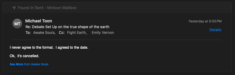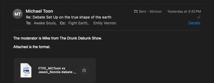 They DEMANDED that FTFE and MCToon debate them. I’ll add screenshots of their begging later. Ronnie said it was going to be after I published all 16 experiments from TFE. But I haven’t done that yet and they decided that they must demand it not, so in late August, 2025 they threw down the latex glove. (They have no gauntlets.) We agreed to have the debate on September 30 at 6pm central time.