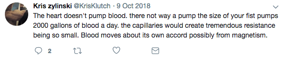 That’s right, Kris can’t understand how the heart pumps blood and thinks it might be magnetism. The level of misunderstanding required to make such a claim is unfathomable.