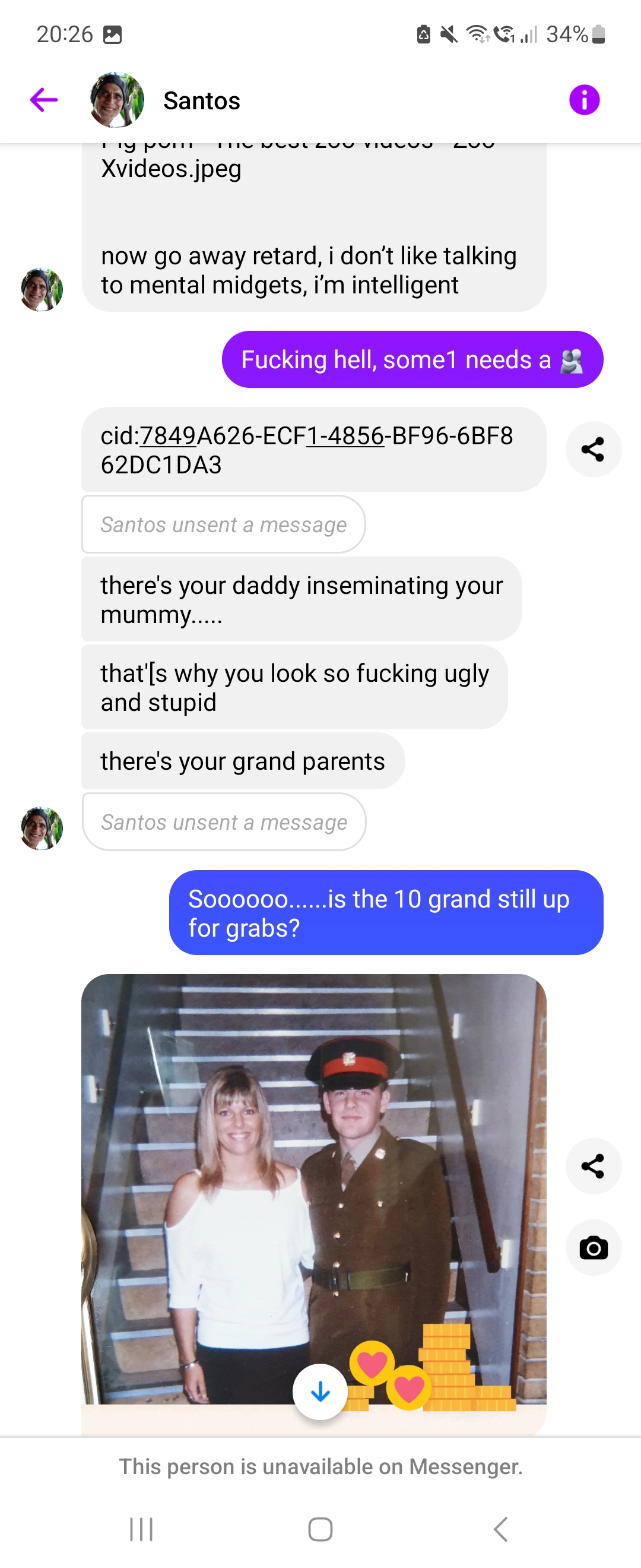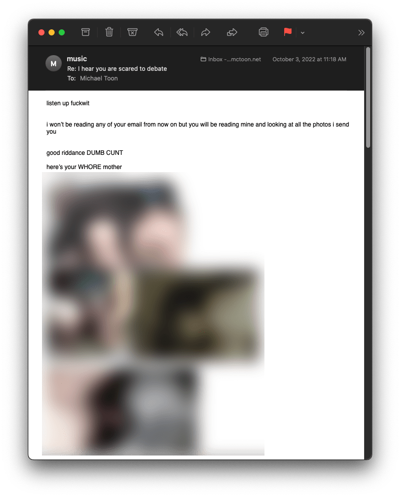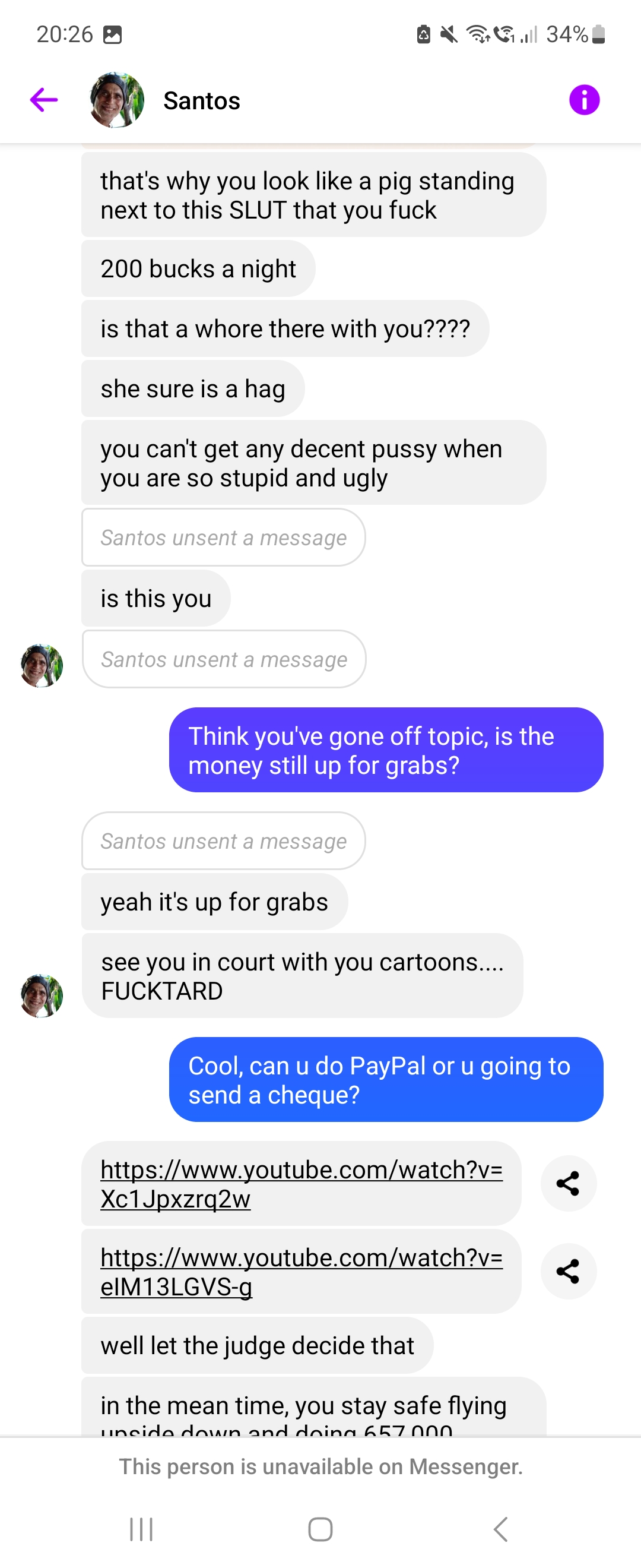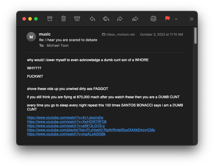 This is a typical email chain from Santos. The links were to nonsense videos, but the attached images were apparently from his personal beastality collection.