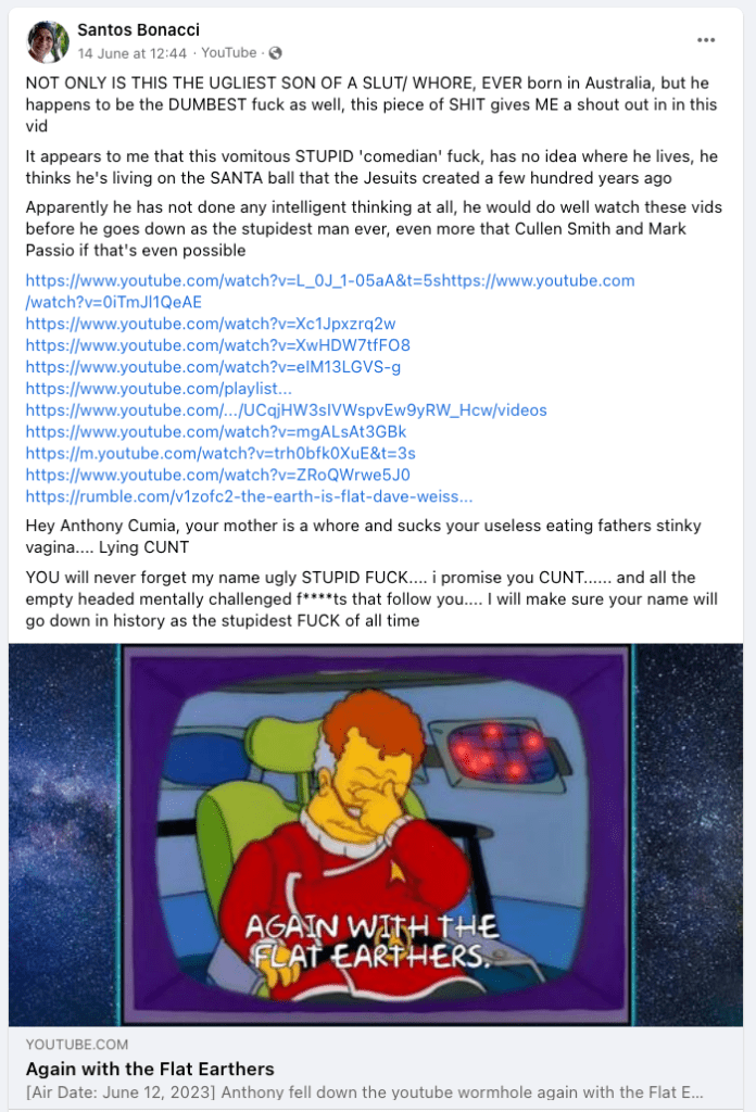 Anyone that disagrees with Santos Bonacci will receive a string of profanity laden insults.