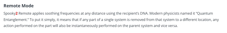 Any physicist will happily tell you that this is 100% nonsense. Quantum entanglement is a very particular process. Different parts of the human body are not quantum entangled. The name of the product, “Spooky”, is referring to “spooky action at a distance”, the phenomenon of quantum entanglement. The entire product is based on the lie that the parts of the human body are quantum entangled.