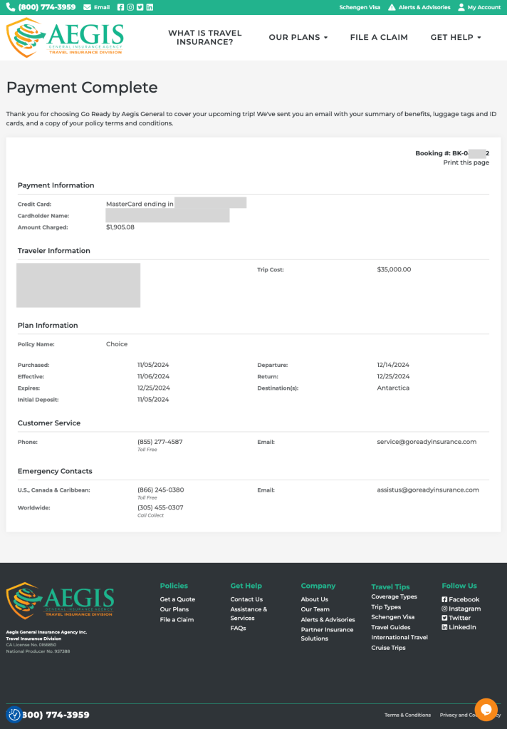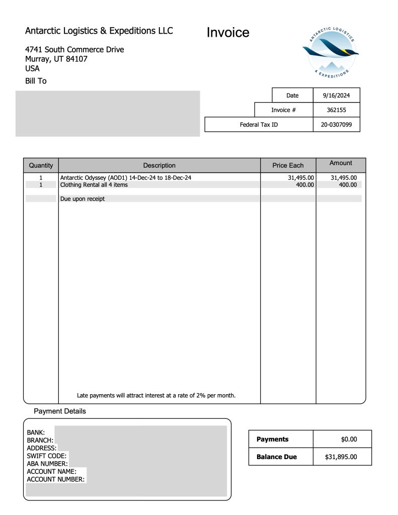 The cost to ALE is $31,495 and the rental of the Polar boots, pants, coat, and sleeping bag brings the total to $31,895.00.