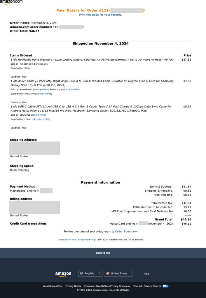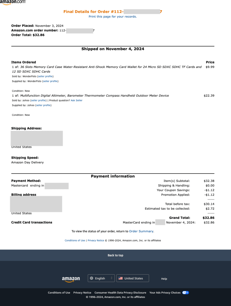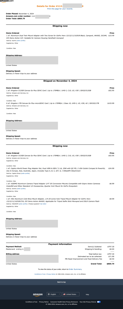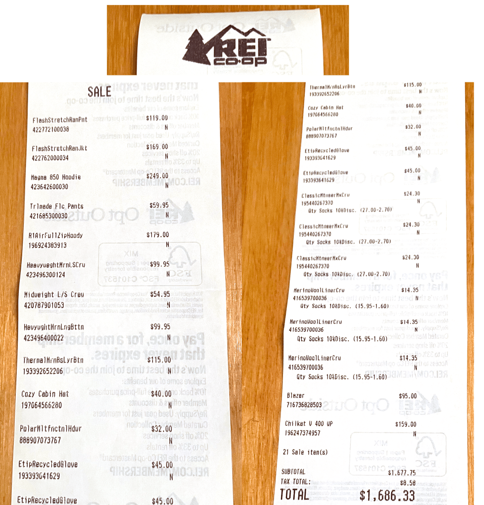 - Camera gear, chemical hand warmers, tripods, battery packs, solar panels, memory cards, etc.