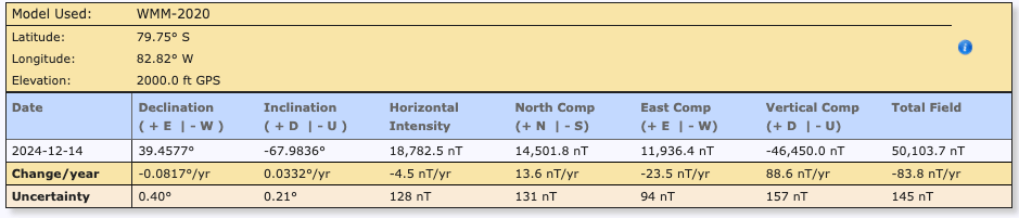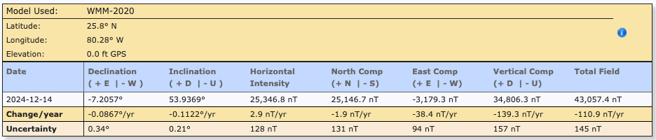 Globe predictions are from the calculator here: https://www.ngdc.noaa.gov/geomag/calculators/magcalc.shtml#igrfwmm