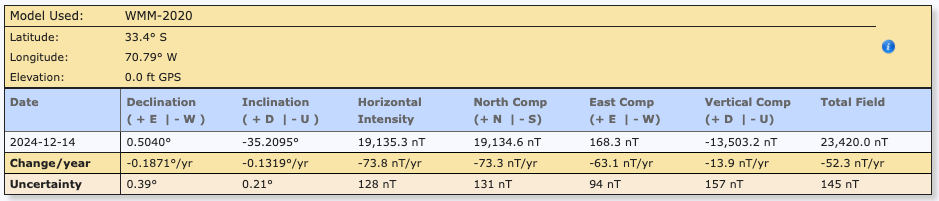 I will be using the dip compass and M5AtomS3 to measure the inclination of the magnetic field, and the Magnetometer app on iPhone and the M5AtomS3 to measure the total field strength.