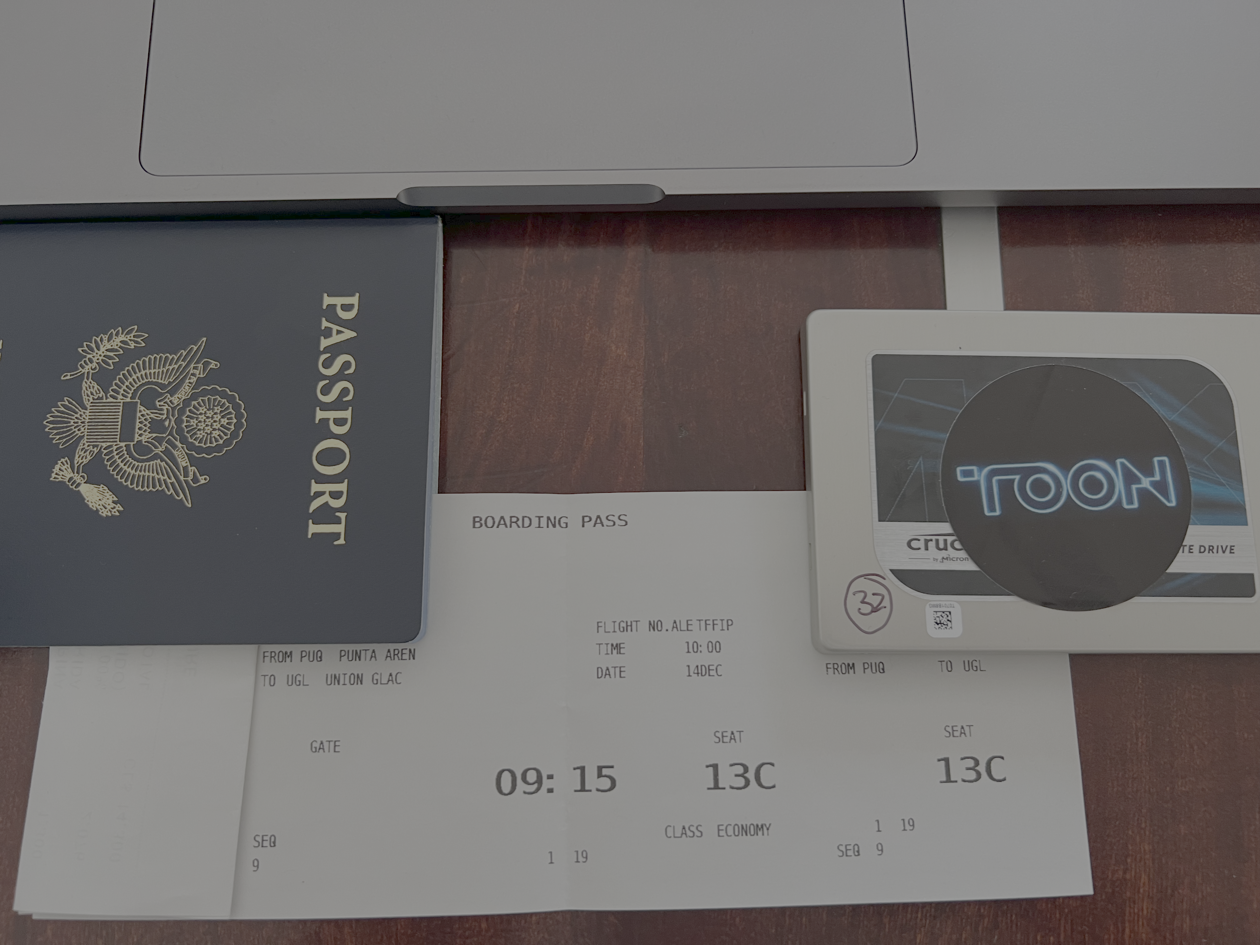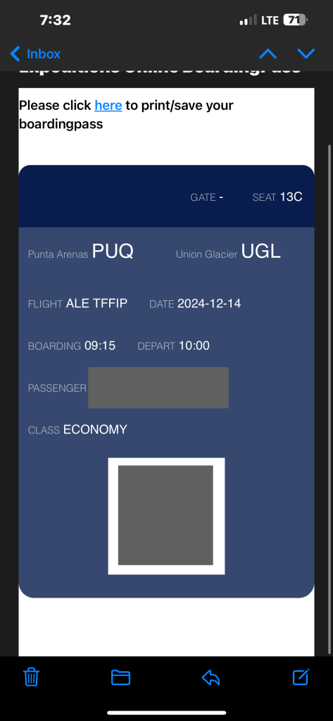 Boarding pass from Punta Arenas to Union Glacier, paper and digital.