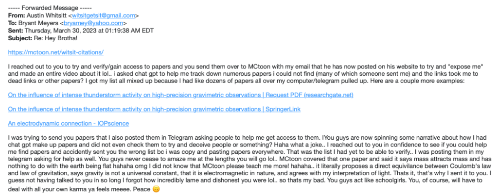 Bryant again responded asking why Witsit asked him to pay for access to the articles. Witsit says “i did not ask you to pay for anything”. Then this “the papers got jumbled up and i was given improper links for them”. Story change #2.
