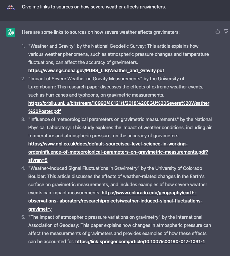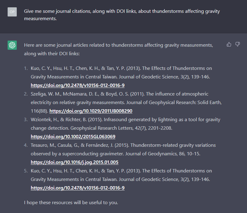 Yes, Austin. That’s exactly what you did. I have tested ChatGPT with several questions asking for citations on the effects of thunderstorms on gravimeters.