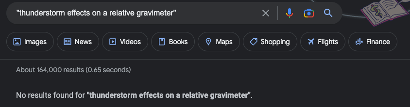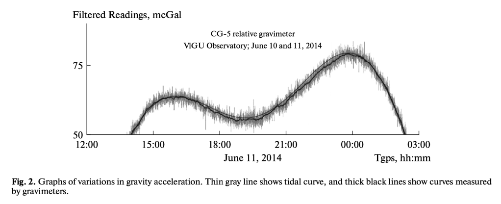 Note the thin gray line in the graph is the predicted variations in the downward acceleration due to tidal forces. That’s the position of the moon and the sun and their effect on the net downward acceleration. Excluding the presence of extra water in the clouds in the vicinity of the station during the thunderstorm. This further confirms the earth-moon-sun relationship in our solar system.