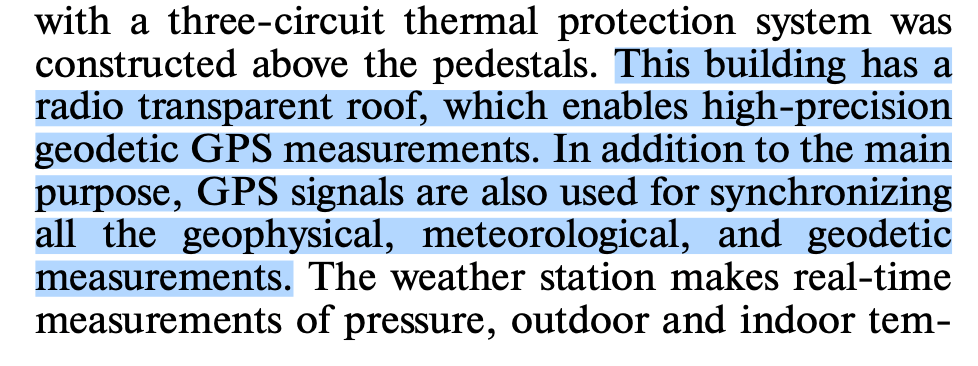 The building that housed the equipment has a “radio transparent roof” so GPS signals could be received. Confirming that GPS reception comes from the sky, not laterally from cell phone towers.